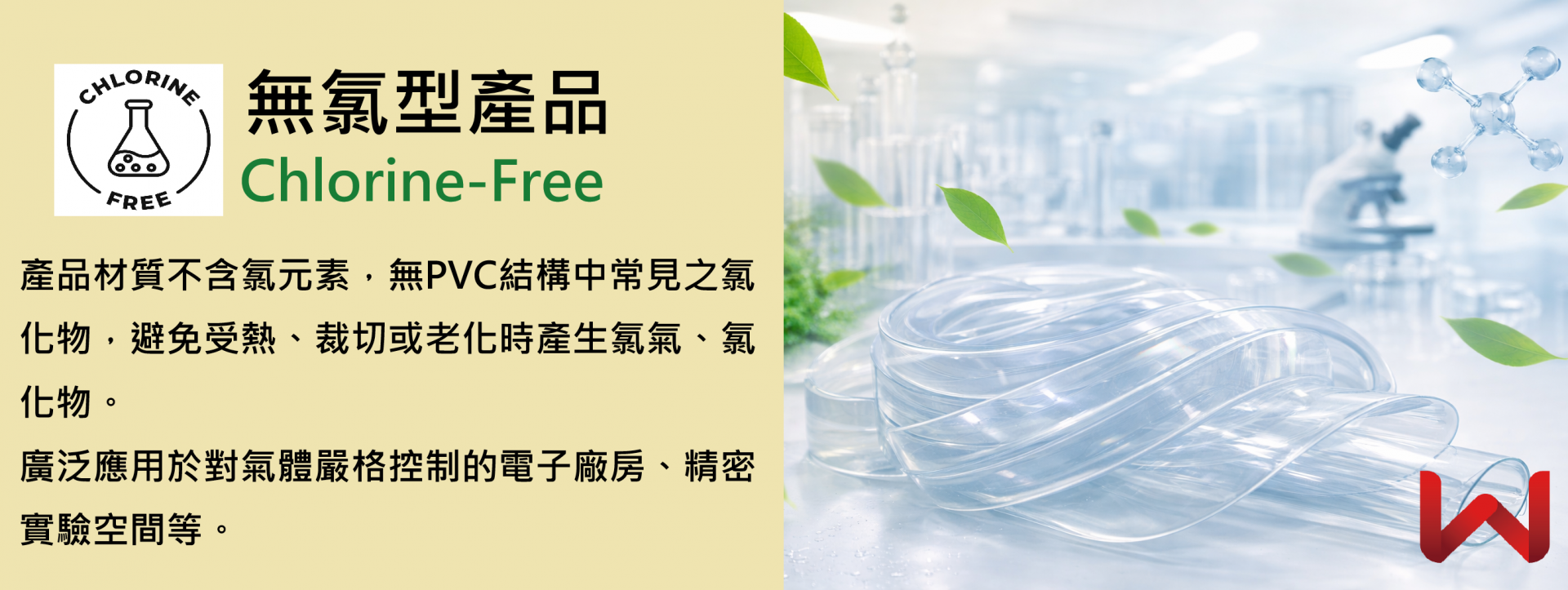 無氯型產品採用不含氯(Chlorine‑Free)配方材質製成,能避免傳統 PVC 材料可能產生的氯相關釋出物問題,適用於對氯元素高度敏感或明文禁用含氯材料的作業環境。