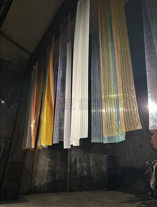 本次藝術裝置以我司供應的高機能條狀門簾為素材,結合不同材質的透光性、色溫與柔軟度,營造出多層次的視覺張力。參觀者穿梭其中,不僅是觀展,更像是走進光影譜寫的詩行。